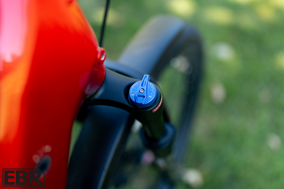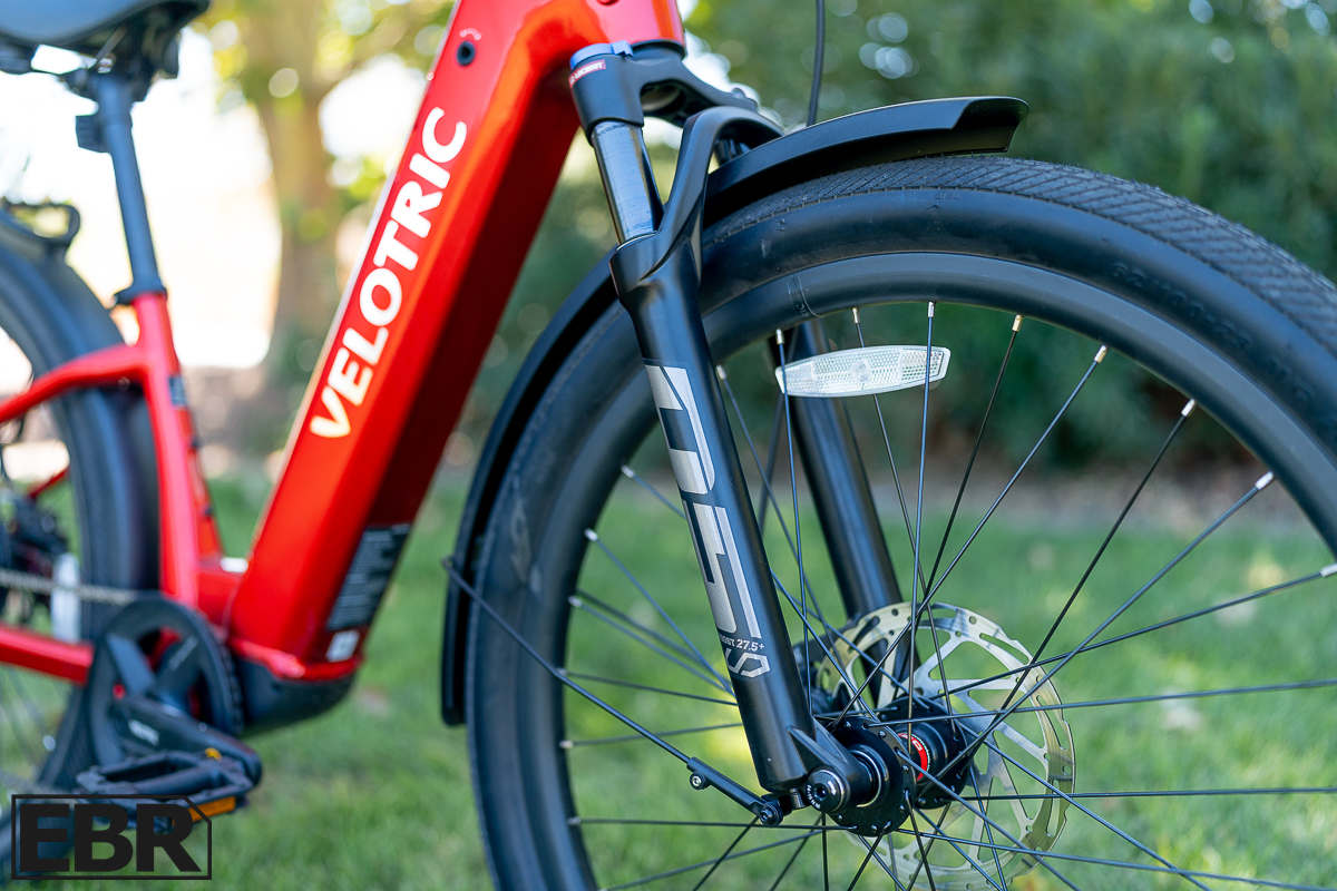 Velotric changed the 80mm-travel fork from the previous one. The old fork featured a quick-release skewer that made taking the front wheel off a snap, but the new version uses a thru-axle and what that does is helps to keep the front wheel from twisting in the fork, a problem common in budget-level suspension forks. The more the front wheel can twist, the less certain the handling feels, which will undermine a rider’s confidence.