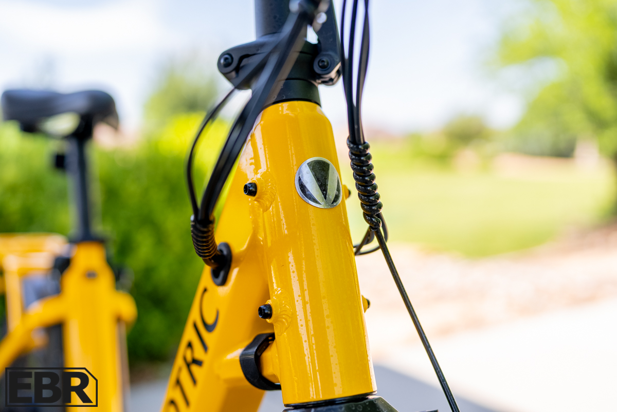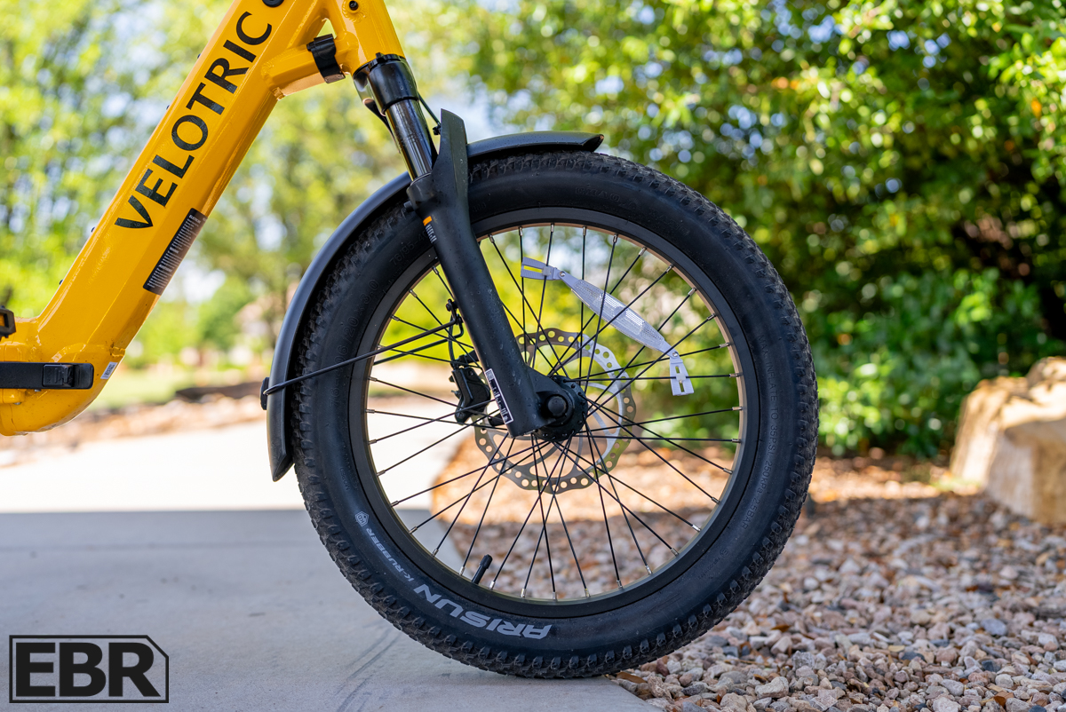 The front suspension fork has 60mm of travel with 34mm stanchions, a nice choice over more commonly seen 32mm stanchions, giving a stiffer, more responsive handling front end with less flex. The font fork also has a bolted front axle and a lockout feature should you want to not use the suspension. Pairing that suspension with the Velotric urban comfort saddle and 3” wide all-terrain tires makes for a good balance of comfort and capability.