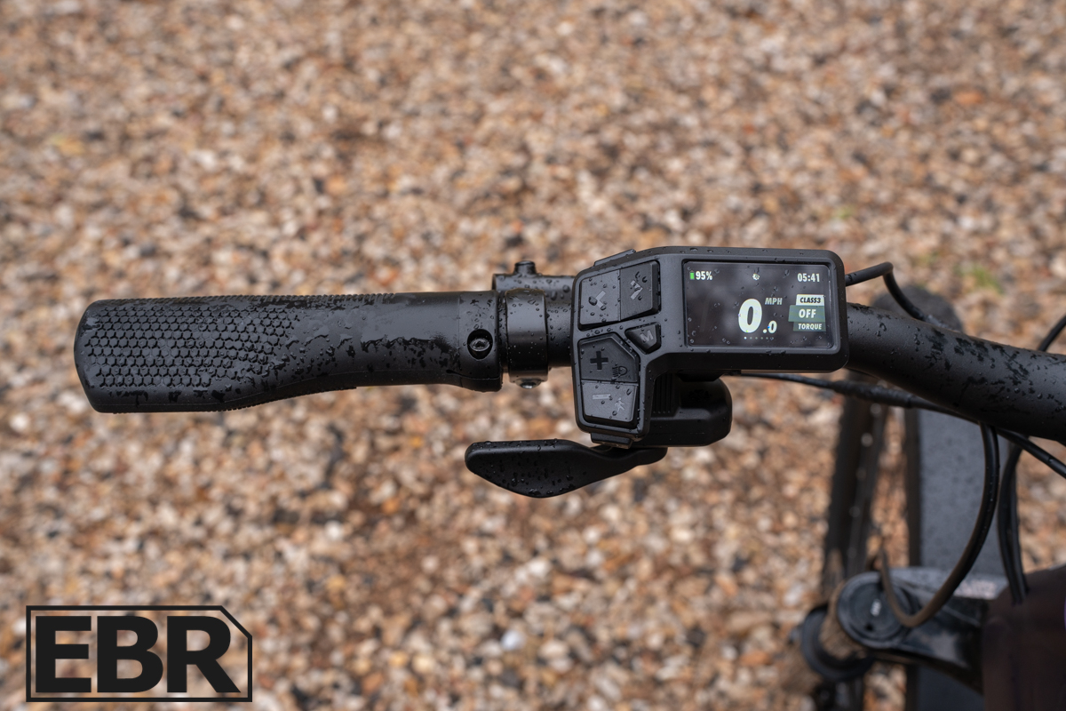 Up in the cockpit, there are a few small yet important improvements. First, Velotric brought the handlebar down in size from 780mm to a slightly more manageable 740mm with a 10° sweep-back; this still enables better rider control even in sketchier terrain. On the left side is the new display control pad and a push throttle, and over on the right are the Shimano CUES index shifter and an included bell, which can also covertly house a GPS tracking tag.