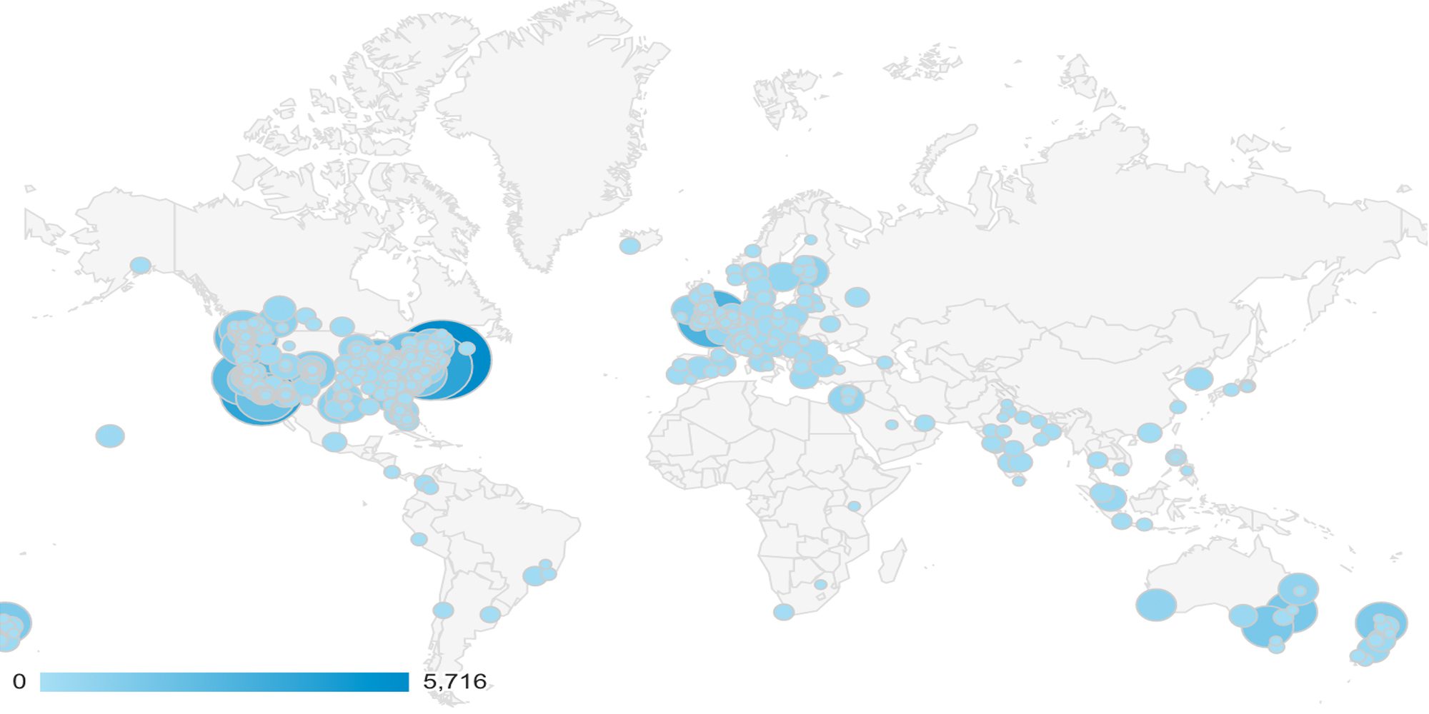 The image below shows unique visits clustered by location over a 30 day period in early 2017. Traffic has grown a lot since this was taken, as the industry has reached new geographies and technology has advanced. Electric Bike Review started in 2012 and we are so thankful to all of the shops and companies that have supported us along the way!