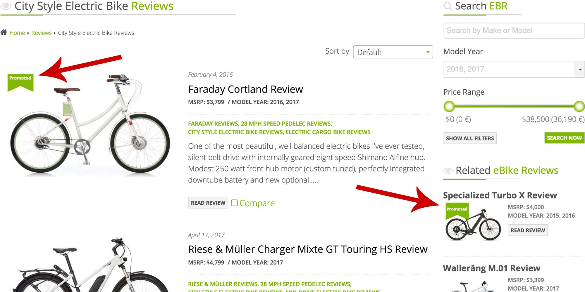 Reviews with the “Promoted” tag (as shown in the screenshot below) have been elevated and pinned to the top of their respective category in order to generate more awareness. ElectricBikeReview.com receives payment for this exposure, but does not alter or enhance reviews in any way. It is our goal to provide unbiased, quantitative content that can lead to informed purchase decisions.